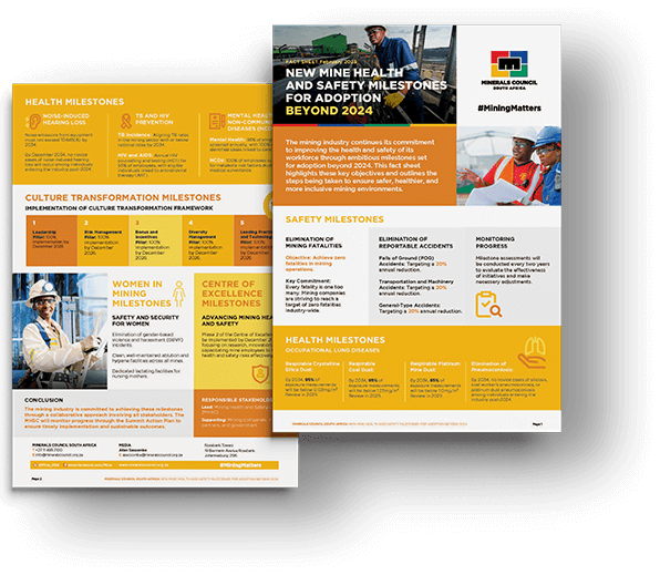 The new mine health and safety milestones for adoption beyond 2024 fact sheet outlines the mining industry’s commitment to improving health and safety, with goals like achieving zero fatalities, reducing reportable accidents, and addressing issues linked to occupational health.